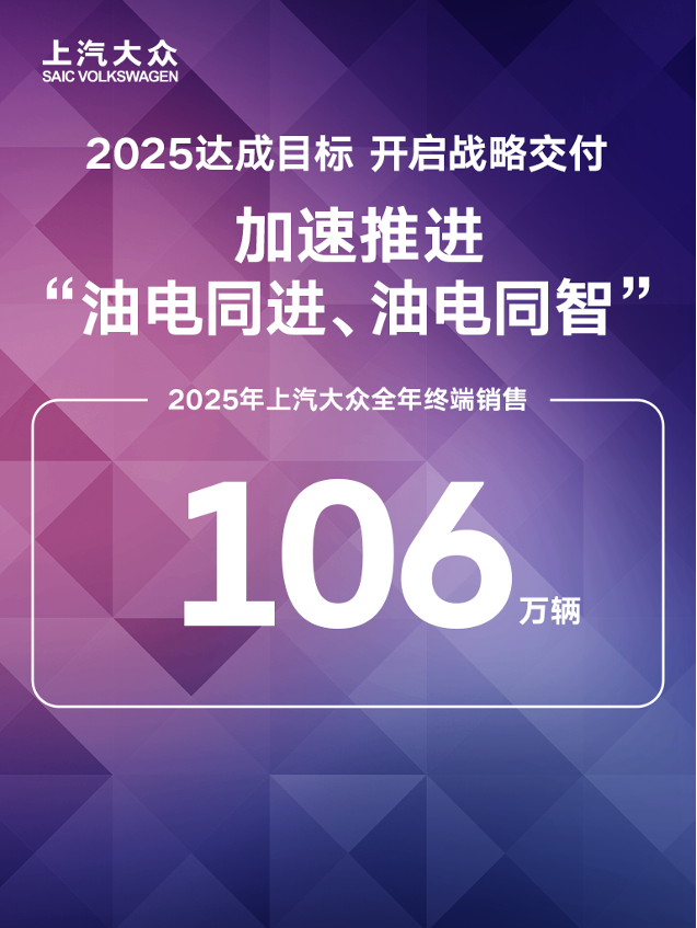 在此背景下,深耕中国市场四十余年的上汽大众交出稳健答卷:全年终端销量达106万辆,稳稳扎根“百万俱乐部”,12月单月终端销量9.6万辆,环比增长10.9%,呈现年末发力回升态势。